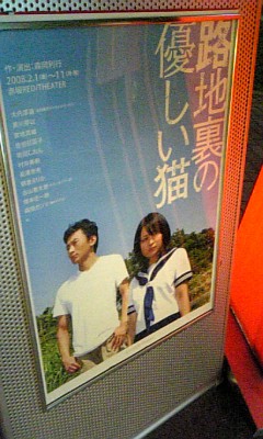 公演2日目にあたる日に鑑賞。映画「子猫の涙」と同じストーリーの別の視点から描いた舞台。メインのストーリーは、ボクシングでは最後のオリンピックメダリストの転落の人生。ありがちな展開(ごめん;)でもありましたが、実話(作者の叔父のボクサー)がベースだそう。キャラメルの大内さんが座長で演じているので、その点は安心して観ていられました。女優陣の、猫の演技、ダンスと歌に観ていてかなり照れる。でも、お目当ては若手女優さんたちで、特撮系、ホラー系映画/TV出演歴の多い人が多数出演してます。これだけ知ってる人が揃うのも、めずらしい。この日は、カーテンコールで、宮地真緒さんの24歳の誕生日祝いが。まだ、若かったんですね。因みに長澤奈央さんは1月5日で同じ24歳だったそう。(以下2回目の観劇につづく)DATA "STRAYDOG" Produce日時:2008年2月1日Fri~11日Mon作/演出:森岡 利行出演: 大内厚雄・黒川芽以・宮地真緒佐伯日菜子・街田しおん・村井美樹・長澤奈央朝倉えりか・古山憲太郎・増本庄一郎・森田ガンツ舞台『路地裏の優しい猫』は、映画『子猫の涙』の原作が再び舞台に蘇る! 日本ボクシング界、最後のメダリスト・森岡栄治の感動の実話!公式サイト: http://www.straydog.info/※小説版 子猫の涙ひとりのボクサーと娘の物語竹書房文庫※黒川芽以-写真集:路地裏の優しい猫☆
