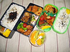 今日は、午前中ばたばた、ばたばた、、、自宅前の道路は先日の水道工事のあとの舗装工事の為、埃っぽい上、、もう、、ちょっといらいら。お仕事なので仕方ないと思うのですが、小ユンボをアイドリングのまま門の前に止めるのは止めて~~チビワンは音と臭いと振動で、、恐怖状態でした。午後からの仕事に備えレジメなど作ったり。。。欲張って、レンジフードを洗おう!などと手出ししたものだから、、ちょっと時間の使い方失敗したりね。今日は高速を節約し一般道でお教室まで。(細かいでしょ、、、節約は小さいことからこつこつと、、、でも、ガソリンがコレほど値上がりして、、、経済走行しても、、、一般道or高速道、、悩むところよ)。夕食はもう、、ちょっと準備できず、、外食。講義中から襲う疲労感、、とうとう帰宅後、横になってしまったよ。起きたらもう11時すぎてたんの。。ガールのお迎えはパパさんが行ってくれた、ありがと~~。*************************昨日の日記に沢山の励ましの言葉ありがとう~なんか、、力づけてくれたり、応援してくれたり、、恥ずかしいぐらい過大に褒めていただいたり、、、ありがとう。自分を持つということは難しいことで、、折れそうな時もあるんだけれど、何とかやってる。きっと、このプログがママ自身を励ましてくれる時があるからだと思う。もう一人の自分を持ち、へこたれた時は励ましてくれるの。どうしようもない時はね、、もう一人の自分に慰めてもらうの。「おう、、よぉやってるよ。褒めタルよ、、、頑張ってるねぇ。」って。「なかなかいけてるよ、、男やったら惚れたるよ!」とかね。この夫婦の形が自然とはいえないけれど、この人生を選んだ私は今ここにこうして生きて生活し、、子供たちを守らないといけない立場にあるのね。私は2人の子供を持てたことを人生で最高の喜びと思って生きているのね。だから、、本当はつよくないけれど、、強く生きている。こんな私に付き合ってくれているプログの仲間に感謝です。本当にありがとう。これからもよろしくお願いします。*********************まだまだ続く、冷蔵庫掃除弁当です。・ブタひらひら肉の(ほんまにひらひら肉)しょうが焼き・厚焼き玉子・エンドウと牛蒡と人参のかき揚・鶏から揚げ・蒟蒻のステーキ「ママたれ」風味焼き・カナギちりめんとしし唐の佃煮・沢庵・ミカン寒・コーンスープだいぶ冷蔵庫や冷凍庫の中が空いて来ました。まだまだ、、がんばれるかな。。。