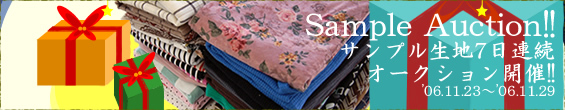 いつもご利用頂きありがとうございます、佐藤です。itty-bitty、サンプル生地福袋オークション明日開始です!!23日~29日の7日間、一日ごとに違う中身の福袋が登場ですv今まで販売しているサンプル生地や、惜しくもネットにアップされる前に売切れてしまったサンプルなどレアな商品をぎゅっと福袋につめました!!そのボリュームといったら!!ずっしりとたっぷりと入っているので是非是非皆様足を運んで見てくださいー!!!詳細はhttp://www.rakuten.co.jp/fab/1792393/こちらから!!ではでは!!