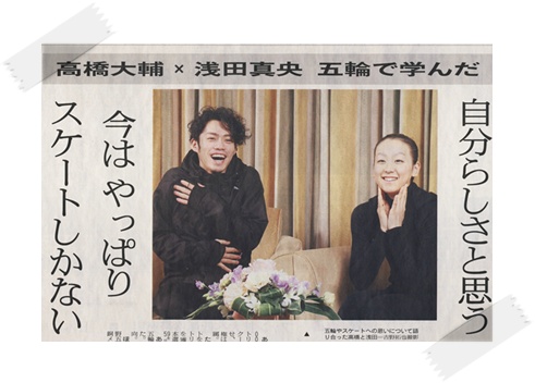今日は弁当持参で朝から出かけてました。夕方帰ってきて ようやく朝刊を開きました。大ちゃんの写真が目に飛び込んできました。演技直後の両手で顔を覆う高橋選手の写真です。。。記事タイトルは「練習の衝突、影響」小塚君が大ちゃんの演技後すぐに謝りに行ったことや小塚君のコメントが載っています。大ちゃんは「今回悪かったことを消せるくらい、一つの過程として練習したい」と語り最後は二人一緒に更衣室から出てきたそうです。 大ちゃん本人が、そのことについて何も語らないので私たちも憶測で語るのは遠慮すべきなのかもしれません。エキシビジョンにも出演するそうなので、私たちが思ってるよりひどくはないと信じましょう!これからも、ますます応援させてもらいますよ~♪ GO GO DAISUKE ♪それから小塚君も次は気にせず頑張れ~~!