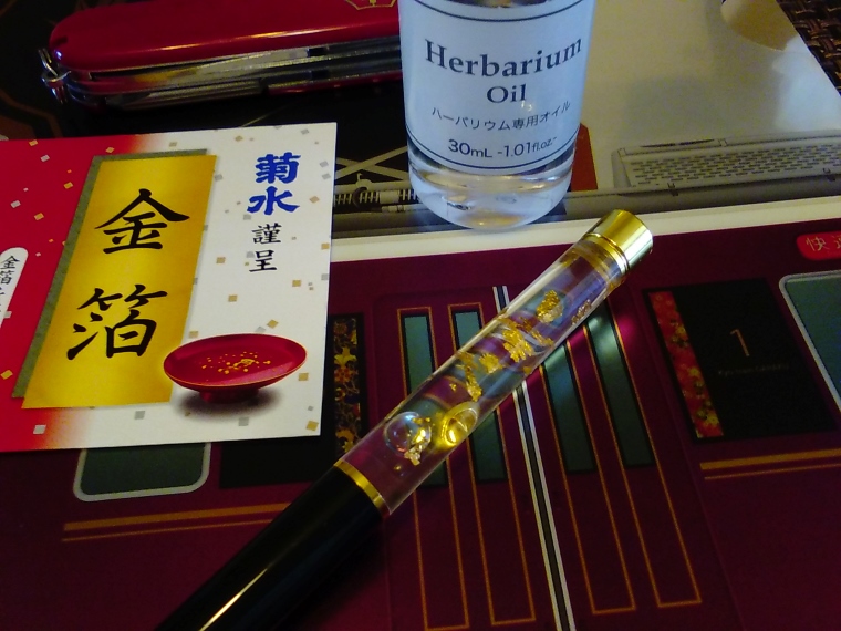 実家の食器棚から見つかった「お酒に浮かべる金箔」~とっくに賞味期限が過ぎていた。捨てるのが大好きな拙者だが、さすがに金箔となると躊躇する。散々考えた挙句、何かの拍子に知ったのが手芸のハーバリウム。ボールペンのような小さな空間なら、微量の金箔でも映えるかなと思った。いざやってみると、なかなか面白いものが出来がった。金運が上向くよう、御守りのつもりで持ってます。![]()