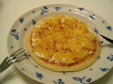 元ネタは 「オレンジページ:フライパン一つでできるレシピ集めました」 から。 「パインとチーズのデザートピザ」 というのがあって、これがおいしそうなんです。これは何としてでも作りたいと思ったな・・・。ところで、このデザートピザのレシピは、「ピザを生地から作るコーナー」 の中にあるんです。でも生地から作るのはやっぱり手間だなぁ・・・スーパー行くと、「ピザの生地」 がちゃんと売っている。こういうのを見ると、ますます生地から作るなんて面倒くさくなる。結局、市販のピザ生地を使うことに・・・。できたはいいが、生地が固い!ちなみに作り方は簡単で、 市販の生地をフライパンでカリッと焼く。あとは上に乗っけるモノを作ればいい。クリームチーズを耐熱ボウルに入れてラップをかけ、電子レンジで加熱して溶かす。それにパイナップル缶の汁を加えてソースを作る。 ピザ生地にソースを一面に塗り、食べやすい大きさに切った缶入りパイナップルを並べる。ケーキシロップを回しかけて、シナモンをふったら出来上がり。 間違いなくうまいはずだと思ったが・・・生地が固っ!それは市販品の性なのか、焼き方がまずかったのか、どちらかだが・・・。食パンを使った方が食べやすいかピザ生地の代わりに食パンを使ってピザトースト、は拙者が時々やってる訳だが、この 「デザートピザ」 を食パンでやった方が無難だということが分かった。ここまでくると パンにチーズを塗ってパイナップルを乗せてケーキシロップとシナモンをかけた、というだけのこと・・・ピザトーストとも言えない代物だが・・・。