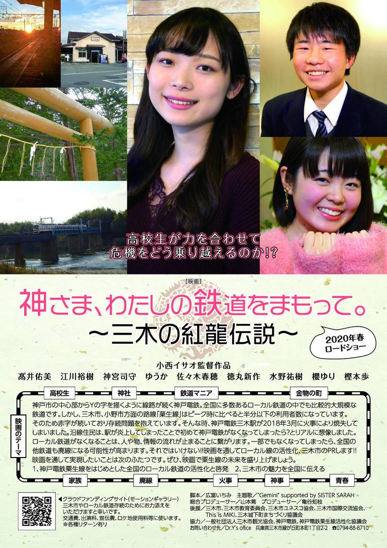 がんばれ粟生線映画製作プロジェクト~この話を発見したきっかけも、三宮から谷上経由で三木に至るような、ある意味遠回りな経緯があった。神戸電鉄粟生線が危機的だという話は前から存じ上げていた。阪急阪神HDの株主として、関連会社の動向はチェックしていて、神鉄の鉄道事業が全体として黒字化したという報道があったので、しばらく大丈夫だろうと安易に考えていたのだ。三木駅が火事で丸焼けになったことなど、東京に居ると全く聴こえて来ない。さて、今度の連休は大阪の家族親戚を訪問することになっているが、新しい京とれいん雅楽でも乗ったろ、と阪急の情報を集め始めていたら、北神急行を神戸市へ譲渡することで合意したという報道を知った。おや?北神弓子はどうなんだろ?と興味本位であちこちサイトを渡り歩いて、久しぶりに粟生線活性化協議会の駅長ブログへ到達したところ、三木駅の火事で粟生線が運休となったことから、いよいよ地元の危機意識が高まり、映画製作のプロジェクトが始まったことがやっと分かった。プロジェクトの内容は、motion galleryというクラウドファンディングのホームページで見ることが出来る。それこそカメ止めとかこの世界の片隅とか、超名作を生み出したクラウドファンディング~概要はぼんやりと承知したつもりでいたが、どんなものかマジマジと拝見させていただいて、何だか面白そうな世界がまた一つ垣間見えて来た感じ。金額によってリターンが設定されており、例えば参千円出せば出演者・スタッフと三木市名所めぐりが出来る、壱万円出せば台詞付き出演権がもらえる、五千円出せばメイキング写真付DVDをもらえる、などなど。参加者もまたリアルに製作に参加するんだなーというところが、東宝の株主になるのと大きな違いと言える・・・。肝心の映画ストーリーはどんな感じ? もうそのまんま引用すると・・・ 兵庫県三木市。神戸に隣接するのどかな町。三木は、古くから金物の町として知られ、高品質な大工道具が海外でも人気を集めている。その三木市にある竜神神社には、90年に一度行われる神事があり、その御神体に願いを祈れば、必ず実現するという。 主人公である神社の宮司の娘は、竜神三希奈。高校2年生。宮司の父親にも、神社にも興味がない三希奈は、刺激のない田舎町から出て都会で一人暮らしをしたいと思っている。 そんなある日、三希奈は、幼馴染で鉄道マニアの青山から「俺、もうすぐ死ぬんだ」と衝撃の告白を受ける。死ぬ前に一度だけ、デートしてほしい。そう言われた三希奈は、渋々遊びに出かける。小さい頃は一緒にたくさん遊んだなと思い出に浸るも、青山の命は長くない。三希奈は、家の神社のご神体に願えば、青山が助かるのではないかと思いつく。 いけないことだとは知りつつも、青山の命を救うためにご神体を持ち出す三希奈。青山と待ち合わせをして、願いを伝えようとした時、ご神体が川に落ちて流されてしま・・・・いとも簡単に「俺もうすぐ死ぬんだ・・・」という設定が安易過ぎてちょっと心配だけど、このベタベタ感で人を油断させといて大どんでん返しをカマす作戦じゃな?都会暮らしに憧れる神社の跡取り娘ときたら、君の名は。の三つ葉を彷彿とさせるが、オマージュを意識されるのならかえって嬉しい。巫女さんつながりでリアル北神弓子の出演はあるのか?とか妄想も膨らむ。翔んで埼玉みたいなノリはハードル高いけど、「説教くさい映画は誰も見たくありません。エンターテイメントとして成立する映画を目指します。」と宣言しているから、一体どんなオチがつくのか興味津々だ。そして肝心の資金調達額だが、百万円の目標金額に対し、当時は約45万円程度集まっていた。さあどうする~拙者としては兵庫県三木市まで出向く必要があるリターンは不可能だし、とにかく完成品を見たいから、五千円出せばメイキング写真付DVDをもらえる、のコースを選ぶことにした。ということで!人生初のクラウドファンディングに参加することになりましたぞ!お題は、「神様、わたしの鉄道をまもって。」さて、五千円の入金を済ませ、motion galleryのホームページに下手クソな応援コメントを入力して、そして数日経ってメールがいろいろ届いていることが分かった。気が向いたらメールをチェックする、というのは昔からの悪い癖で、こんな輩にラインとかフェイスブックとか無理な話である。溜まったメールを読ませていただいた。プロデューサー様からの挨拶、近況報告とか、そして最近チラシが出来ました!とのこと。「現在、印刷もいたしておりますが、ネット上での情報伝達などにも使っていただけるとありがたいです。」という表現に悩んでしまった。こっちはブログやホームページしか無いから、画像貼り付けしか思い浮かばない。著作権のことがどうも気になって仕方ないが、チラシというなら思い切って貼っちゃう!こんな感じです。主な配役はオーディションで既に決まっ
