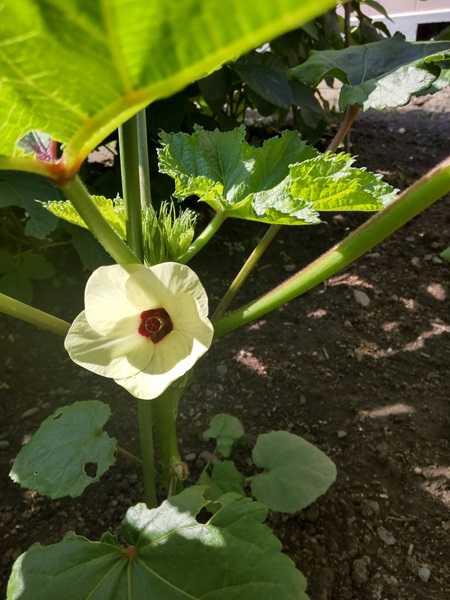 遅く種を蒔いたオクラも花が咲き始めました。