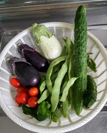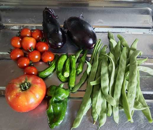 そんな暑さにも負けず畑のナス3種類がそろって収穫できました!
