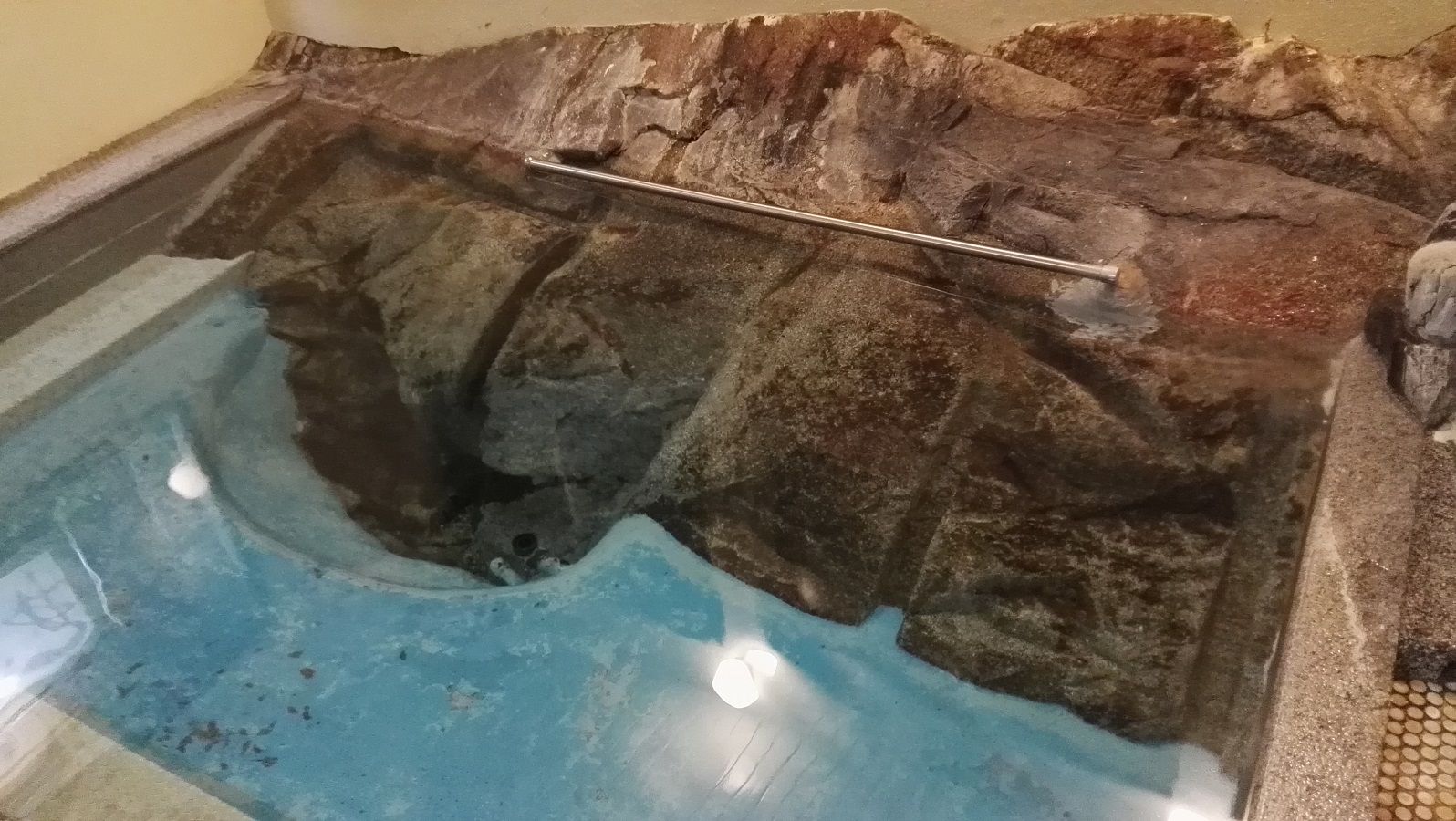 岩の人工の溝は、殿様の入浴用に木組の湯船をしつらえた跡と。温泉自体は、天文3年(1534年)発見と。アルカリ性単純泉、39.3度。