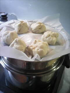 今日は天気も悪く布団も干せない状態。旦那さんは昨日の夜も仕事で朝6時半ごろの帰宅予定だったので、朝5時頃から起きてお風呂の準備、ご飯の支度、掃除などをしていました。朝7時頃かな。ちょっと頭が痛く、二日酔い?(昨日はご近所と遅い新年会をやっていました)と思い2階で寝ていましたが。お昼頃になって、子供たちがお腹すいた~というので、冷蔵庫の中を見て、うーん、何しよう・・・と色々考えていた結果。久しぶりに肉まんを作りました。材料:A(皮):薄力粉200g、強力粉200g、ドライイースト大1、砂糖1/2カップ、サラダ油大1、ぬるま湯200cc~220ccB(具):豚肉200g、干しいたけ:7~8枚(水に戻す)たけのこ:小1個、長ネギ1本、生姜1片、塩小1/2、しょうゆ大3、酒大2、砂糖大1/2、こしょう少々1:Aの粉類をボウルに入れてぬるま湯を少しずつ入れてこねる。 生地の練り具合によってぬるま湯をじょじょに注ぐ(一度に注がない) その間に蒸し器に水を入れて湯を沸かす。2:ボウルに薄く油を塗ってその中に1でこねた生地を入れる。 蒸し器が沸騰したら火をとめて、ボウルにを中に入れて発酵させる(15分間)3:発酵している間、Bの材料全てをフードプロセッサーでみじん切りする。 (調味料もそのとき一緒に入れる)フードプロセッサーがない場合は材料を小さく切る。 その場合肉はひき肉を使う)4:2を取り出しガス抜きをして16等分にし生地を手で伸ばし中に具を入れる・ 蒸し器にクッキングシートを入れて12分蒸せば出来上がり♪↑こんな感じで蒸しております。2段になっているので下の段にも肉マンが5個入っています。出来上がりはこんな感じ♪本当は16個出来上がったんだけど、子供たちが食べちゃったの。久しぶりに作ったのでガツガツいって食べていました。形は悪いのは許してください(笑)スープも一番下の段で作ったのよ。たまねぎを入れておいたから肉まんができたときにはいい感じに柔らかくなっていました。プラス肉まんからも若干肉汁が出てくるので、下のスープに入っています。もちろん、肉汁は少ししか出ないので、ウエイパーという調味料を使って最終味付けしてあります。たまねぎ以外は昨日我が家でご近所さんと鍋宴会をやったので、その残りの野菜(水菜、しいたけなど)を入れています。肉まん16個とスープで材料費は500円ぐらいかな。手間はかかるけど、安くていっぱい肉まんを食べたい方にはお薦めだよ!子供たちと一緒に肉まんを作ったのでとても楽しく遊びながら作れました♪中身の具が少し残ったので夕飯で青梗菜と一緒に炒める予定です。ちなみに我が家は全てフードプロセッサーを使って生地をこねたり、材料をみじんきりしました。なので出来上がるまで1時間かかっていないんだ~。ところで私、さっきからダルイと思っていたら熱が37.3度!平熱が35.6度なのでちょっとダルイです・・・。今日はセレクトショップにいこうかと思っていたけど、無理かも・・・(涙)