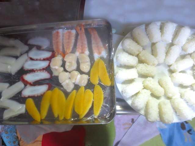 寿司ネタを解凍して寿司しゃもじでシャリをつくりました