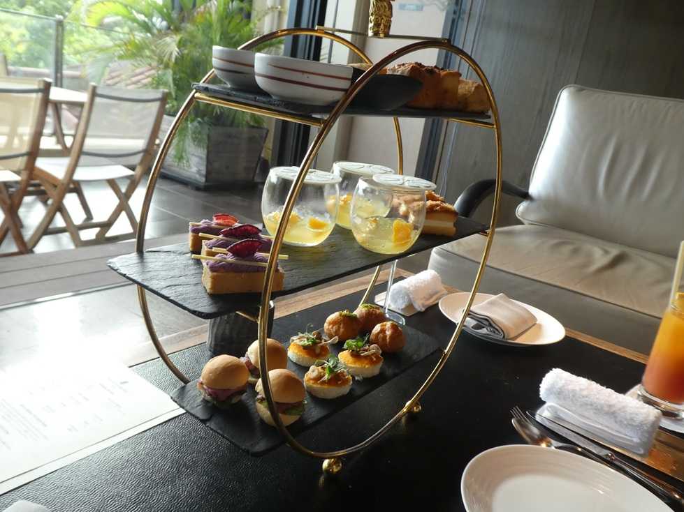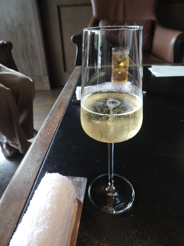 今回、到着したのは1500頃なので、アフタヌーンティーの時間だった。 席に着くと先ず飲み物のオーダーを実施。 当然、シャンパン。 まもなく食べ物が運ばれて来た。