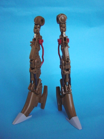 一昨日の朝と昨晩とでここまで作りました。細かい部品が多く、墨入れのヶ所もナカナカ多いので足首までとはいえあなどれません。おまけにやたらと稼動用のシリンダーが多そうなのでメッキシルバーで塗るのが大変です。変形機構もないのにこんなに動きます。足の裏にはサザビーさんやνガンダムと同じ引っ掛けが付いてます。ガンプラルームへ戻る