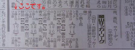 当ブログのトップページにこんなのを作りました。はっきり言って自慢話以外の何物でもございませんので悪しからず♪********じんさんの得点記録********(純粋に自慢話)ここにはいつまで続けられるか分かりませんが、私の得点記録(山陽新聞に載ったのだけ)をコツコツと積み上げて行こうと所存しておる次第で御座候。******** 20070923 対岡山クラブ戦 ********掲載された場所が離れて分かりにくかったので、二枚に加工しました。まずはウットコのチームが赤い字で書いてあるココ。フォース対岡山クラブ1-0で勝っちゃってますね。で、はい!きた!コレコレ。マジで取りました。1点。嬉しかったなぁ。^^******** 20071007 対萩原工業戦 ********2得点。のこり数分、持ちこたえたら勝ってたのになぁ・・・まあ、でも得点は得点で記録に残りますからね。平田ってのは僕なんかよりず~~~~~~~~っと上手なリョウ君です。リョウ君のへでんぐシュートも素晴らしかったよ。戻る