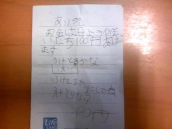 実は、いま我が家の愛ちゃん 欲しいものがあってお小遣いを一生懸命貯めています。 それを和志が...多分こっそり使い込んでしまい それを返すと約束したとき自分で作ったものが これ 訳すとこうなります。 ************************************** あいえ(愛へ) お金は日ようび(お小遣いは毎週日曜日) まいにち100円あげます うけとるかな [ はい ] (ナニゲに愛ちゃんの方が字が上手) うけとるか }にしてね うけとらない 300円(総額) ************************************** びみょ~~に誤字脱字が多いところは親父似ですね。(笑 それで昨日の日曜日 和志が自分のお小遣いもらって 使い込もうとしていたので あらかじめ写メにこいつを撮っておいた僕は 和志にこの契約書をみせて納得させました。 これはお金がなくなって泣き叫んでいた愛ちゃんを 納得させる(黙らせる)ために和志が自分で考えて 自分で書き込んだ契約書。 自分でこんな契約書を作るくらいだから ヤッパリ犯人は和志だったのでしょうね。 昨日はとうとう自分が使うお小遣いが なくなってしまい、半泣きしてました。(笑)