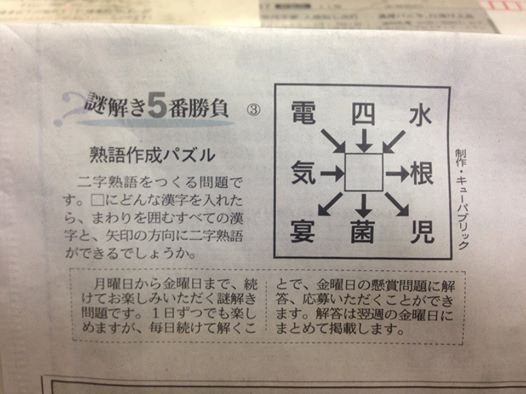 お盆期間に溜まった新聞を読破していて、謎解き問題に目が留まる。熟語作成パズルと呼ばれているもので、たまに謎解きに挑んでいる。今回目に留まった問題は中々難問ながら正解が気になり、食事等を挟んでもずっと考え続けていた。何時間か経過後、ふっと思いつく漢字があり、あてはめてみると全て熟語が成立し、謎が解けた!(自分の中では)難問かつ良問だと思われるこの問題、皆様わかりますか?わかった方もコメントには正解書き込まないで下さいね(笑)正解はリンク先に。 以下のリンクをクリックして下さると、一票投票されて人気blogランキングに反映されるシステムになっています(一日一票)。毎日更新の励みになります。→人気blogランキング<起業・独立部門> ご支援クリックいつもありがとうございます!ただいま148位に。
