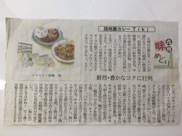 新聞の「九州味めぐり」コラムで紹介されていた渡辺通路地裏のカレー屋さん。 週一で早朝レッスンに通っている真弓ダンススタジオさんのすぐ真裏にあると判明し、本日やっと訪問。一見路地の奥にお店があるとは思えないロケーションで、道路上の看板も目立たずわかりにくい。勇気を出して奥へ進むと、二階建ての古民家を改造した店舗が現れ、中へ入ると二階のテーブル席を案内される。私がオーダーしたのは「本日のココナッツカレー」。ほどなく運ばれてきたものを口にすると、一瞬ココナッツの香りと甘みを感じたが、次の瞬間色々なスパイスのミックスした強烈な辛さが。食べ続けていると汗が止まらず、持参したハンカチの濡れてない部分が全くなくなるほどびしょびしょに(-_-;)。でも超美味しいぞ!私が入店した後も次々に来店される方が現れ、さすが繁盛店の活氣を実感。店内に流れるレゲエ風のBGMもグッド!! Written by 人力車の博多人力屋 以下のリンクをクリックして下さると、一票投票されて人気blogランキングに反映されるシステムになっています(一日一票)。毎日更新の励みになります。→人気blogランキング<起業・独立部門> ご支援クリックいつもありがとうございます!ただいま125位に。
