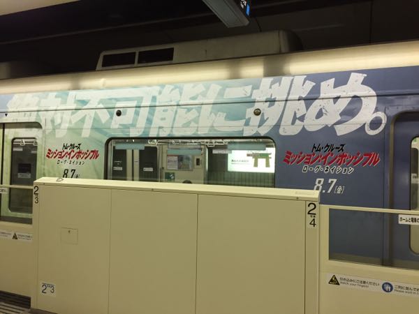 連日の当日ご予約電話で、本日は横浜から一人でお見えの女性を観光人力車でご案内。ご依頼のキッカケは、・福岡ドームでのソフトバンクホークス観戦目的で初めて来福。・夕方までの空き時間を埋めるため、「博多 観光」をキーワードに検索していて当方のHPを発見。という流れ。Yさん、この度のご用命本当にありがとうございます。そして肝心のホークスも逆転サヨナラ勝ちしラッキーでした!祈りが通じた!! ※画像は、地下鉄貝塚線でたまたま乗り合わせた「ミッション:インポッシブル/ローグ・ネイション」ラッピング車両。Written by 人力車の博多人力屋 以下のリンクをクリックして下さると、一票投票されて人気blogランキングに反映されるシステムになっています(一日一票)。毎日更新の励みになります。→人気blogランキング<起業・独立部門> ご支援クリックいつもありがとうございます!ただいま97位に。