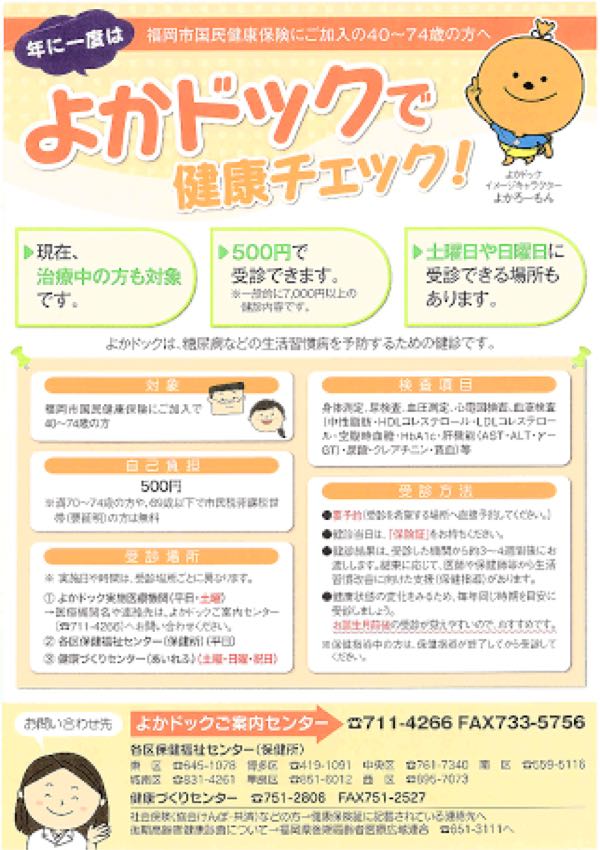 前日の眼科検診に引き続き、本日はよかドック「特定健診」の日。オフシーズンのこの時期、一年に一回の人間ドックに入るのは身体が資本の身として当然のこと。高校生時代、病気一つしたことのなかった父親を心筋梗塞で亡くして(享年48歳)以来「自分の命は自分で守る」という姿勢に。昨年は大腸ポリープの切除手術を完了し、今現在特に懸念はないが、自覚意識のない不具合を早期発見できるのが一番のメリット。体調万全にして秋のハイシーズンに突入しよう! Written by 人力車の博多人力屋 以下のリンクをクリックして下さると、一票投票されて人気blogランキングに反映されるシステムになっています(一日一票)。毎日更新の励みになります。→人気blogランキング<起業・独立部門> ご支援クリックいつもありがとうございます!ただいま100位に。