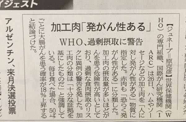 ネットニュースや新聞にも掲載されていた「加工肉の過剰摂取=発がん性ある」とWHOが警告した件。この話は前職にいた頃、健康食品の代理店向け研修でよくネタにされていた。ハムやソーセージのパッケージ裏の成分表示表をコピーして資料として配布し、恐怖のモチベーション(笑)として活用していた。が、この話題は社員自らの脳裏にも刷り込まれ以来あまり加工肉系を食べなくなったのは事実。全く否定する訳ではないが、過剰な摂取は控えるのが賢明かと。 Written by 人力車の博多人力屋 以下のリンクをクリックして下さると、一票投票されて人気blogランキングに反映されるシステムになっています(一日一票)。毎日更新の励みになります。→人気blogランキング<起業・独立部門> ご支援クリックいつもありがとうございます!ただいま60位に。