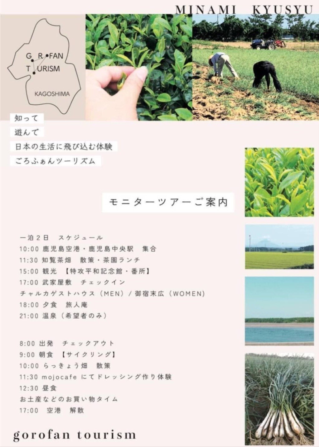 早朝4時半には起床し自宅出発。博多バスターミナル5時55分発の高速バスで鹿児島方面へ。本日より南九州市知覧町で開催される農園モニターツアーにスタッフ本間と共に参加。鹿児島空港で現地スタッフの方と合流し、ワゴン車で一路知覧へ。茶畑(大麦若葉)工場見学、茶園ランチ、番所鼻、釜蓋神社、特攻記念平和館の訪問等、ハードなスケジュールをこなし夕食会場へ。大阪で修業された料理人提供の食事は、本格的な会席料理で圧巻!参加者10名+αや現地在住の方、元々他県出身者が多くキャリアも様々。何かのご縁で集った初対面ばかりの顔ぶれながら、皆さん本当にフレンドリーな方ばかりで、楽しい時間はあっという間。この度の貴重なツアーを主催してくださった現地スタッフの方に、この場をお借りしてお礼申し上げます。ツアーは翌29日(火)まで続きます。☆拙著『好き飯』博多の人力車 裸一貫起業術2019年11月21日発売!〜雇われず『好き』な仕事で『飯』を食う〜※「独立起業」なん か無縁で、今の職場で一生安 泰だと思ってる方には、お薦めしません。Written by 人力車の博多人力屋以下のリンクをクリックして下さると、一票投票されて人気blogランキングに反映されるシステムになっています(一日一票)。毎日更新の励みになります。↓起業・独立ランキング3 ご支援クリックいつもありがとうございます!ただいま14位に。