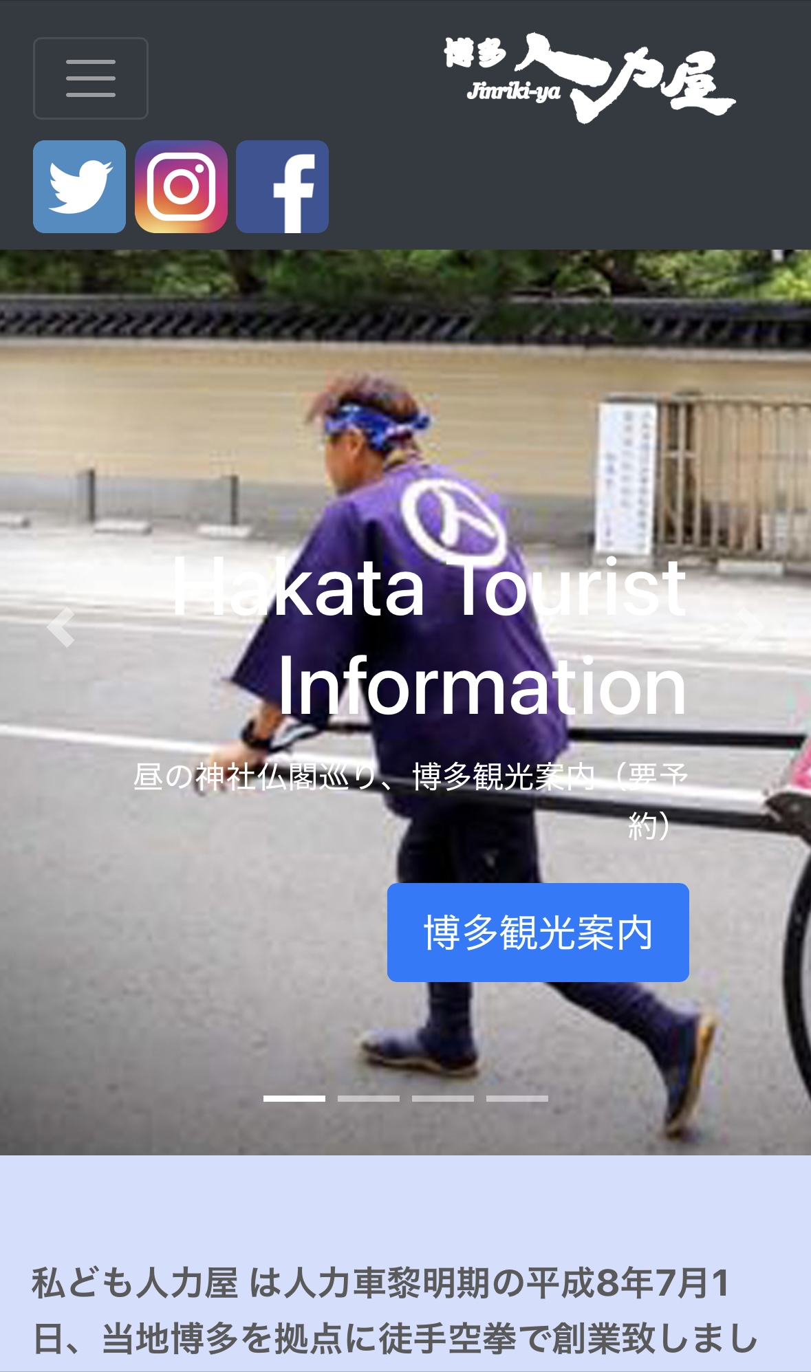 現在ホームページの更新作業(マイナーチェンジ)中だが、主力の人力車部門に加えて◇獅子舞の博多寿会(2012年~)◇福岡パーティチャリ(2024年~)の三本柱体制となっているのは不明瞭。今回はFacebookやInstagramをホームページ代用のまま更新予定だが、いずれはすべて含めたリニューアルが必要。新プロジェクトに関してはまず実績を積み上げることが先決で、対応できるスタッフの育成も急務。一朝一夕にはいかないことであり、一歩ずつ段階を踏んで進めたい。☆拙著『好き飯』博多の人力車 裸一貫起業術2019年11月21日発売!〜雇われず『好き』な仕事で『飯』を食う〜※「独立起業」なん か無縁で、今の職場で一生安 泰だと思ってる方には、お薦めしません。Written by 人力車の博多人力屋以下のリンクをクリックして下さると、一票投票されて人気blogランキングに反映されるシステムになっています(一日一票)。毎日更新の励みになります。↓起業・独立ランキング3 ご支援クリックいつもありがとうございます!ただいま12位に。