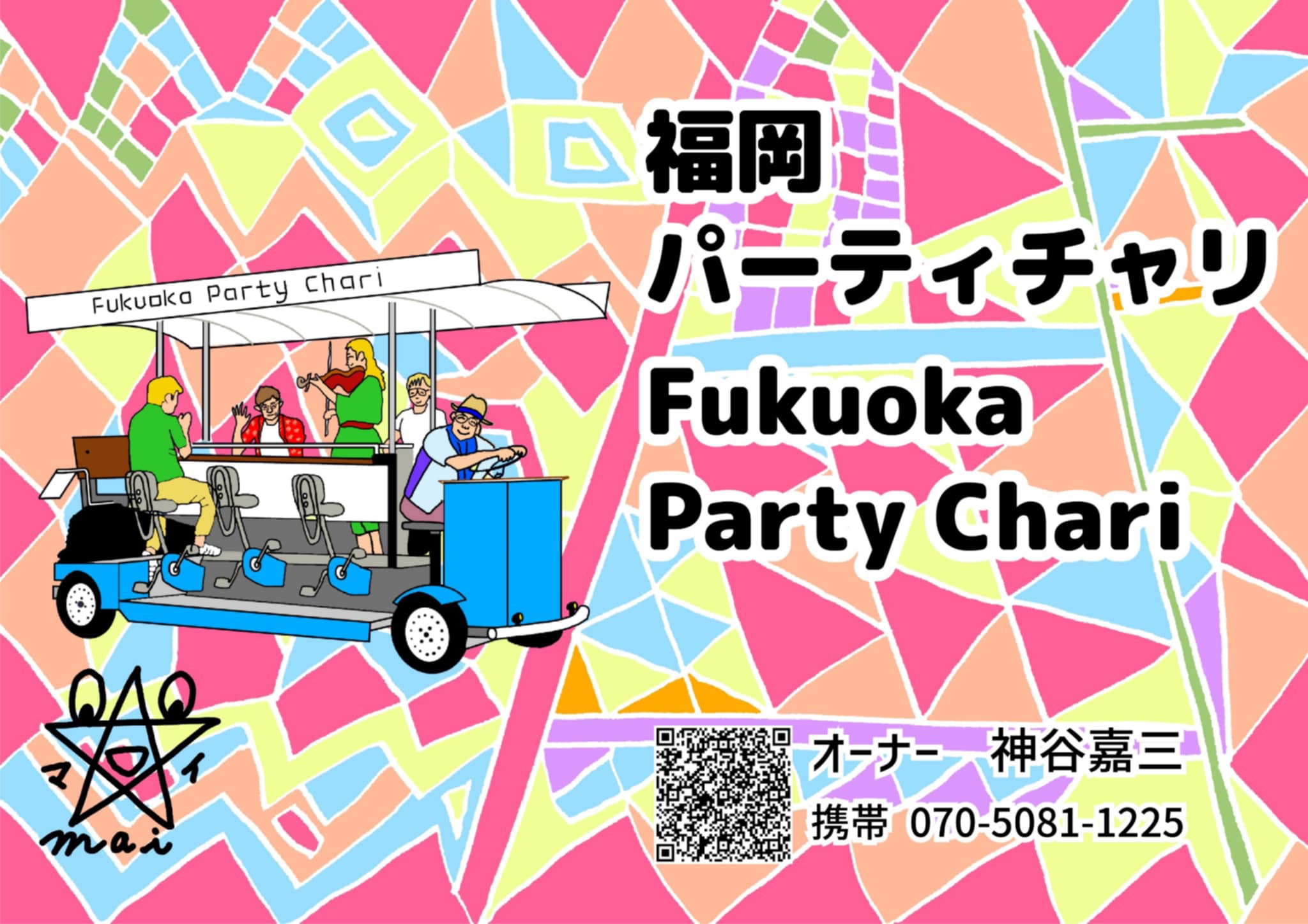 20日(月)は二十四節気の大寒にあたるが、今週一週間は比較的温暖な予報。週明け、何故か団体での観光ご予約お問い合わせが相次ぐ。一つは外国人相手に人力車6台を用意して欲しい、という依頼だったが、私自身が当日出張しておりNG。もう一つは人力車4台手配のご依頼で、最悪先方若手の方が人力車夫役をやってもいいという申し出(笑)。スタッフ宛に周知したところ、奇跡的にスタッフ4名の確保が確定。久々に古参スタッフ含め一堂に会することになり、賑わいそう♪現在水面下で進行しているホームページのマイナーチェンジにより、更なる集客効果を目指そう!◇知人イラストレーターに持ち掛けていた、新プロジェクト「福岡パーティチャリ」のイラスト。私の個人的希望を考慮してもらい、彼の得意な幾何学模様とサイン風のものを追加。今後ショップカード的な使い方を始めとして活用したい。☆拙著『好き飯』博多の人力車 裸一貫起業術2019年11月21日発売!〜雇われず『好き』な仕事で『飯』を食う〜※「独立起業」なん か無縁で、今の職場で一生安 泰だと思ってる方には、お薦めしません。Written by 人力車の博多人力屋以下のリンクをクリックして下さると、一票投票されて人気blogランキングに反映されるシステムになっています(一日一票)。毎日更新の励みになります。↓起業・独立ランキング3 ご支援クリックいつもありがとうございます!ただいま13位に。