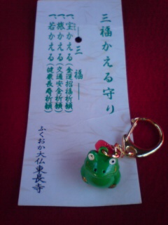 昨日お客様からいただいた「ふくおか大仏東長寺お守り」が何となく福を呼ぶ縁起もののような気がして、常備しようと思っている。その名も「三福かえる守り」という緑色をしたカエルのお守り。添付の能書きには次のような文句が記されている。