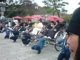 朝チェックアウトを済ませて屋外に出ると、本日の結婚式で使用する人力車が既に5台待機。同業で面識のあるメンバーが二人おり、しばらく談話している間に、あっという間に出発時刻に。本日の主役である 有風亭 青木登さんと新婦いづみさんの登場で周囲は大勢の人だかりとなり、BGMの流れる中を厳かな門出。脱サラ後25年にして初婚の青木さんの人生を思うと感慨はひとしおで、思わず目頭が熱くなった。車夫の新郎自らが新婦を乗せた車を曳く姿を見るのは貴重な場面。神前挙式の行われる鶴岡八幡宮まで同行し、一部始終を見届けた。