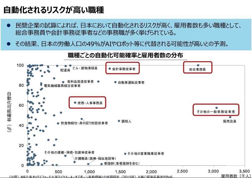 ※たまたまTwitterで見かけた「自動化されるリスクが高い職種」の図表。私が会社員時代最後にやっていた支店事務職は随分前に派遣社員に代替され、会社に残っていたら間違いなくリストラ対象。今後は更にAIやロボットに代替されていく可能性あり。100年先でも生き残れる仕事を目指そう。
