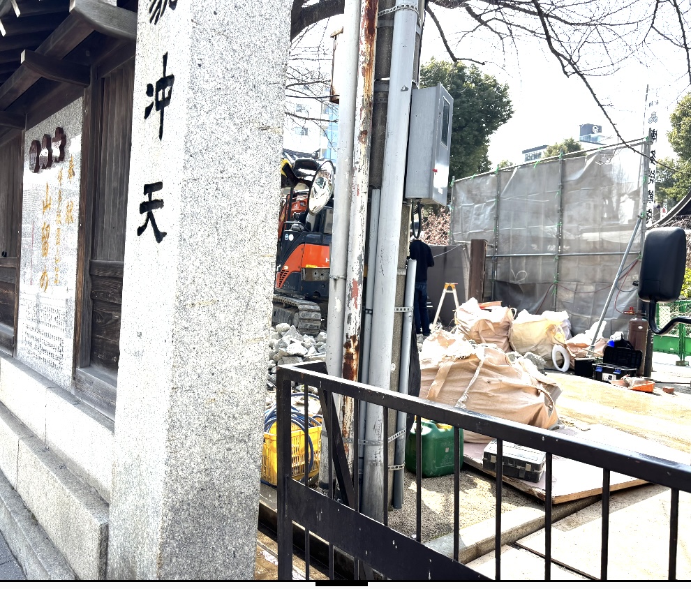 ◇観光拠点目の前の櫛田神社境内、すでに南門側にトイレが移設され、旧トイレの解体作業開始。