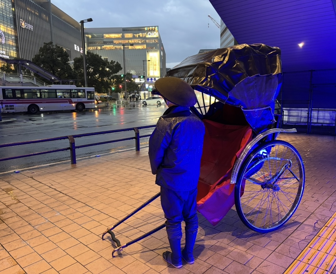 トラックでの搬出作業あるため、人力車を町家棟に移動してセッティング。私以外のスタッフ2名がたまに稼働するのを裏方で見ながら夕方まで。天気予報どおり雨が降り始め先に人力車1台を撤収。その後ナイトクルージングご予約(中国語通訳ご希望)に対応するため、李さんと共にJR博多駅前へ移動。が、到着した瞬間に雨天を理由にドタキャンメールが(-_-;)。インバウンドあるあるのリスクはやむなし。