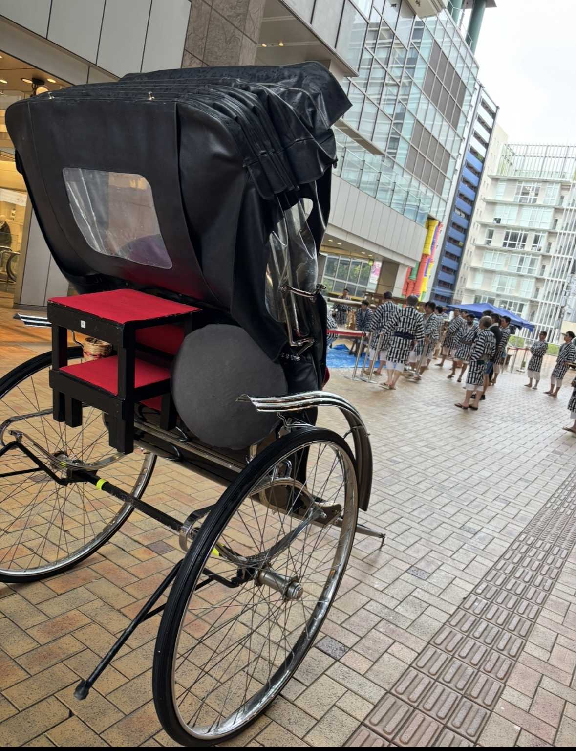 週末土曜日、朝8時には自宅を出発。大雨予報が気になる中、車庫で人力車セッティングの準備をしているうち一旦雨が降り止む。ホテルオークラ福岡様まで自走し、本日婚礼人力車で櫛田神社への往復送迎。