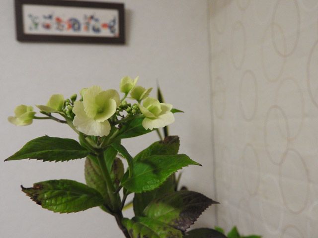 夜の冬紫陽花昼の冬紫陽花夏にはどんな感じか覚えていないが出窓に冬紫陽花が咲きました。ご近所から頂いた一本ですが初めてです。カップボードの蔦は年々伸びてます。伸びすぎても邪魔になります。