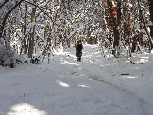 風も無い日中の林の中は静か。雪道を歩く自分の足音だけの世界。だが行き良いとしても帰るお昼頃は気温も上がりフイに枝だから雪が落ちる。やがてさらさらと音もして顔が冷たい。降っていなくても帽子は被っていた方がよい。