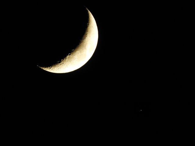 1月3日の17時10分頃 二日の夕、犬小屋からみたお月さん、夕星(ゆうずつ、宵の明星=金星)が接近してしていて奇麗!カメラ持ち出したら雲隠れ。それで次の日、3日ははもうかなり離れて投げキッスの距離になりました。夜空のきれいな冬の夜です。