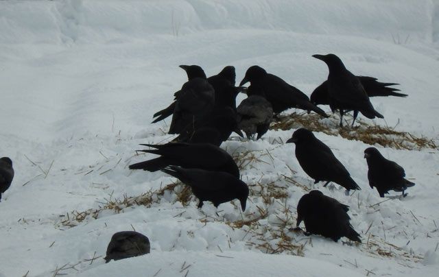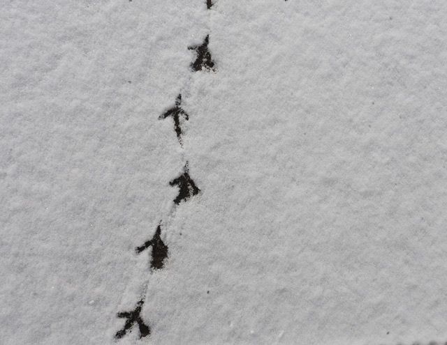 雪原の鴉柿の木の上雀の群れいずれも冬の鳥ですが、一枚目わずかな草を見つけたのでしょうか餌あさりしてました。この足跡に次の日いち早くそこだけ雪が解け土が現れました。二枚目は渋柿の鴉、わずかに残る柿を食べているようです。時にそれを枝ごと折って遠くの路上に運ぶこともあります。三枚目は雀ですがこちらもわずかに残る叢で餌あさりしてました。