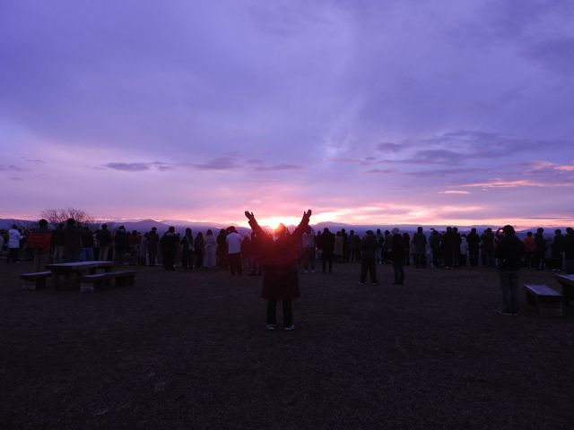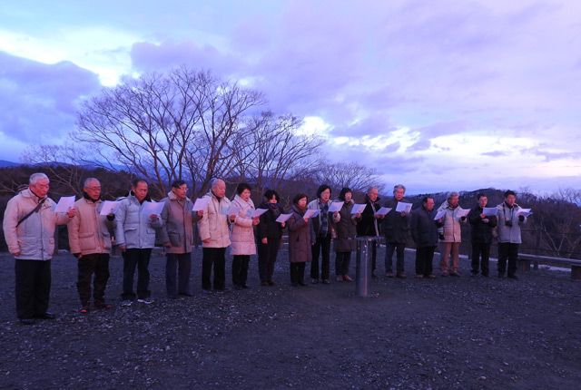 渋川詩吟会の皆さん霞ヶ城天守台から初日の出を待つ人々。やがて日の出がでて辺り一帯をピンクに染め万歳の声が上がります。安達太良山は雪雲の中、築城602年目の朝です。やがて朗朗と響く歌声、毎年の恒例と聞きました。