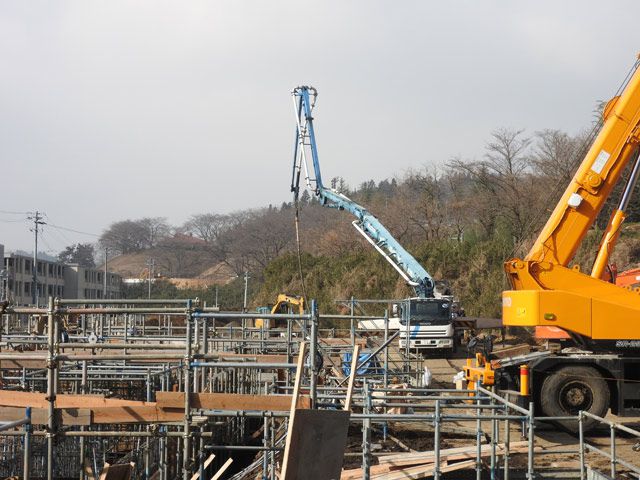 反対側からだと伸びた部分がより、像の鼻そっくりに見えます。角度を変えてみると首長竜に見えるかも?災害復興住宅のある一角に最後の建物が工事中です。既に住宅部分は使い始めております。この場所年末まで測量しておりました。年が明けたらくい打ちが始まりました。その内鉄筋がきてそれを組み立て、現在コンクリートの打設中です。着々と建物が現れ春には完成する事でしょう。