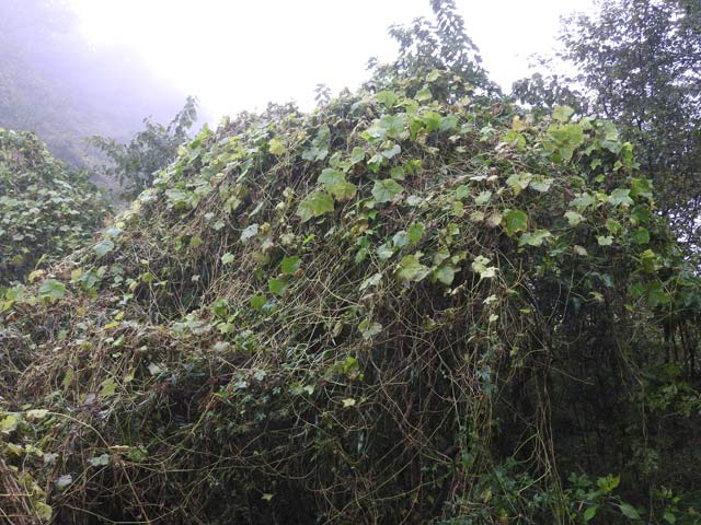 アレチウリ 台風通り過ぎて二三日は暖かい空気期待しましたが昨日は時雨れました。背中がぞくぞくして途中で着物足しました。夏には樹木をビッシリ隠したアレチウリの葉っぱも枯れて蔓だけがのこりました。まったく厄介な蔓で小さい棘がギッシリ付いていてうっかり触れません。葛も嫌われ物ですがそんな事はありません。時には籠などにその蔓は利用されてます。このまま3年もすれば樹木も枯れてやがて崩れ落ちます。