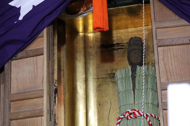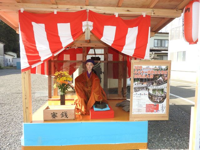 鐘突き小僧×印は二本松藩の紋章原動力の水車二本松市油井字福岡の長谷11面観世音の33年ぶりの衣替えが行われます。言わば観音様の普段見られない秘仏公開の日でもあります。その藁や衣、護摩供養の薪、等々役割が昔からそれぞれの家に割り当てられ今も継続しております。そしてお殿様も迎え10月7日より準備を行い最後の9日の間に行われます。この像はその護摩供養が行われる長谷寺の袂を流れる油井川の水を使い入口で鐘をつき皆様を迎えるそうです。当日だけでは勿体ないと奇麗なお顔の小僧さんが街道筋で毎日鐘を鳴らしておりました。