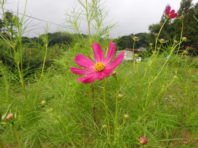 コスモスがあちこち咲いてます。場所により伸びて風に斜めにされながらも土手などでも車道側へ伸びてます。家の脇もそうですがベビーカーで押しのけつつ通ります。普段は田んぼ道が多いけれど、白壁にゆれるのも良いですね。