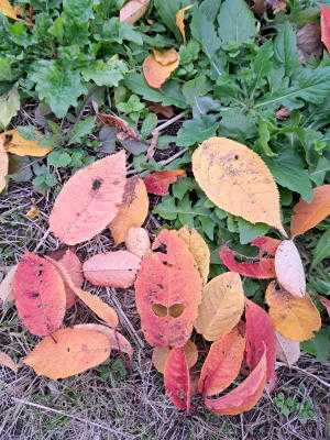 落ち葉の色もいろいろ、虫食いもあり愉快な物も。
