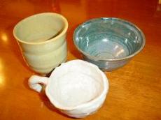 今日届きました。先日行った笠間の「陶火まつり」という焼き物市で、娘と夫が挑戦した作品です。手前のは娘の作品で、なんだか凹凸がたくさんあってちょっと飲み難そうな感じ。でも取っ手が壊れなくて良かったわ。本人も初めての経験だったので、出来上がりを見て驚いていました。そして、後ろの二つは夫がロクロで作ったもの。湯のみはウ~ン?・・・の出来ですが、お茶碗はなかなかじゃない?さっそく娘はジュースを入れて飲み、夫はご飯を・・・二人とも大満足でした。今度は私も挑戦したいな・・・
