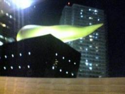 これは先日、首都高速で撮った写真です。ビルの屋上にある大きなオブジェ!うちの家族では以前からいったい何?「もしかしてウン○?」「まっさかぁ!」なぁんて話していたのですが、なんとこのオブジェはビール会社のビルだったのです。しかも、屋上の黄色い物体はなんと!ビールの泡のオブジェだって!そう言われてみれば、ビルはジョッキのような形だし、ビルの表面は昼間は金色に光ってる・・・う~ん、もっとわかりやすい形の方がいいのでは・・・