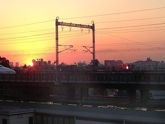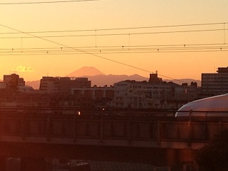 富士山、新幹線、夕日、のコラボ。LUKEから見えるスカイツリーも、毎晩衣替え。ほぼ帰り道なので。