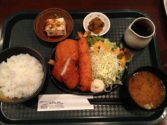 立川「BLACK POT」のミックスフライ定食。1.オープン時刻過ぎても「closed」になっていたので、扉を開けて「やってますか?」と聞いたら、「は?」と聞き返される2.ランチタイムは水曜日だけ禁煙という不徹底さ3.コーヒーは食後に、と言ったのに、途中で登場4.1080円でさらに消費税加算チェックメイト。
