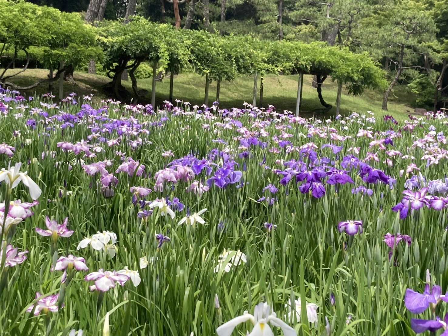 菖蒲園の背景に 小高い丘に藤棚や松林がありました