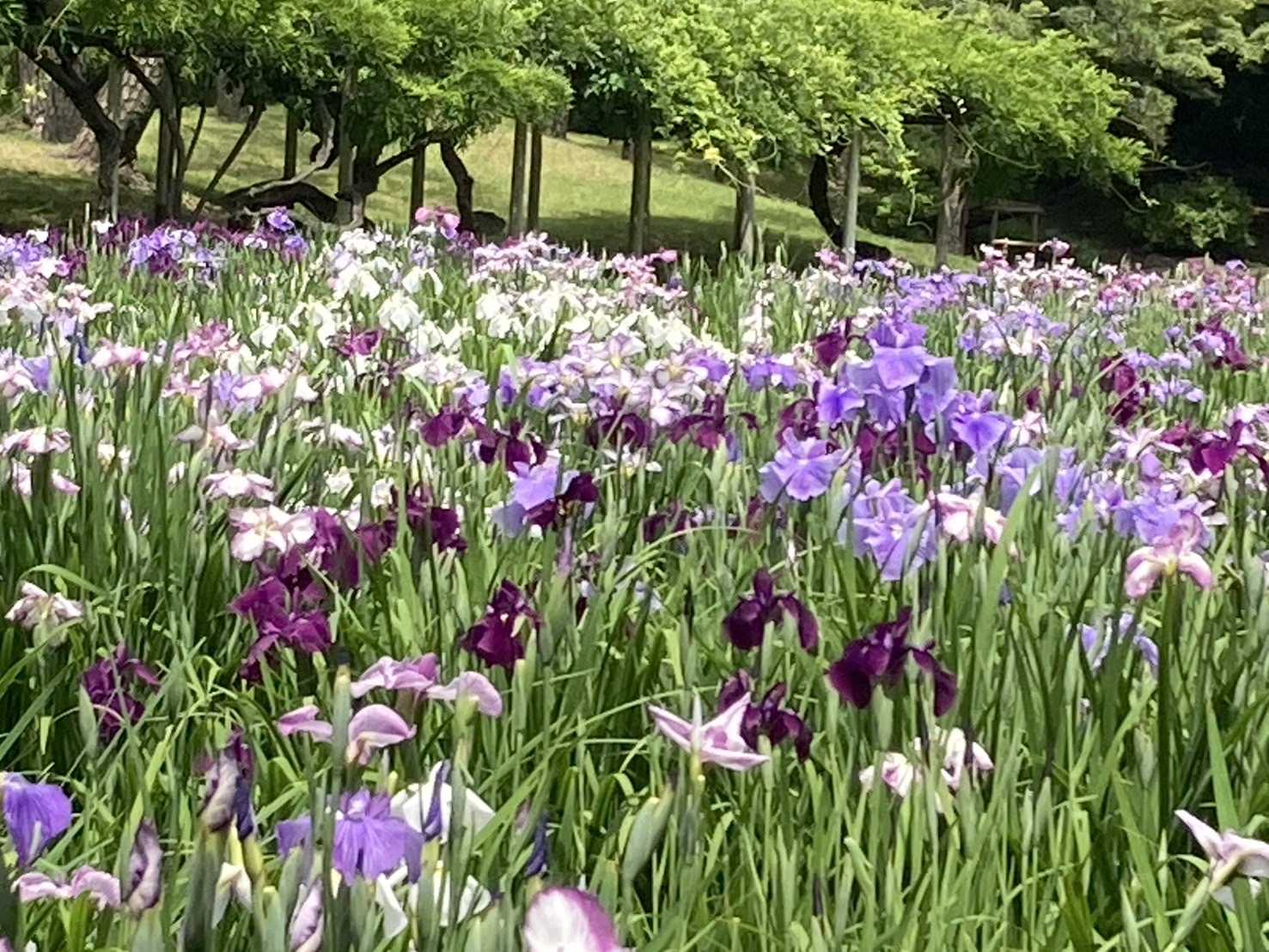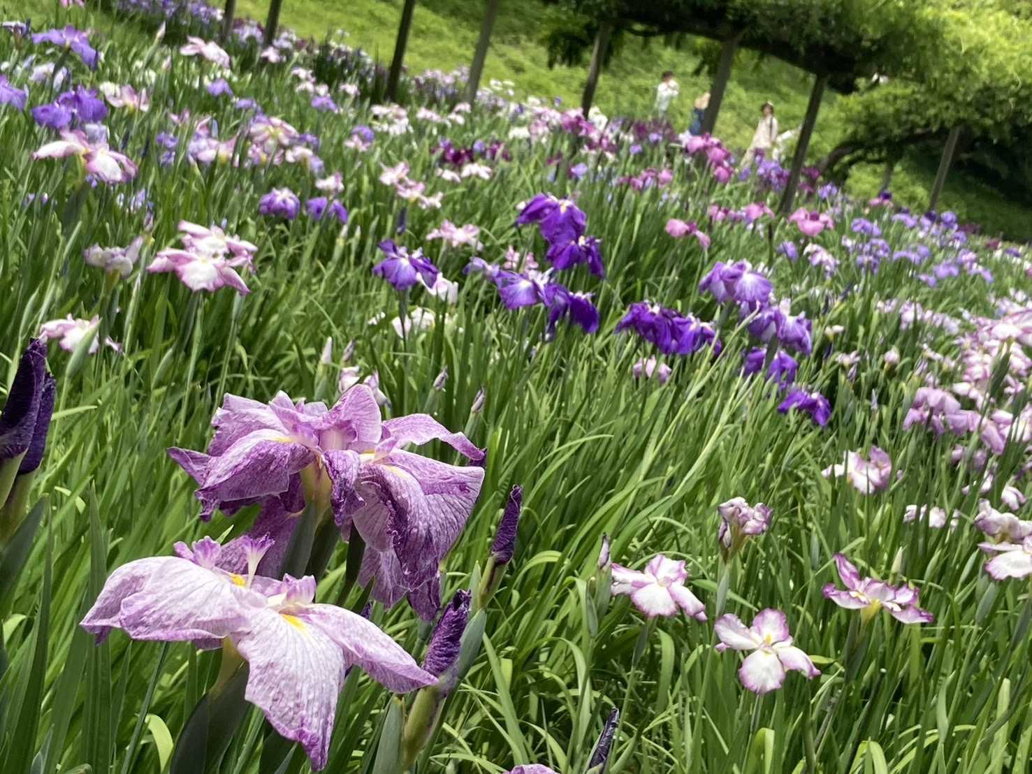 茅葺き屋根の休憩所と菖蒲の花のコラボ風景が素晴らしいです