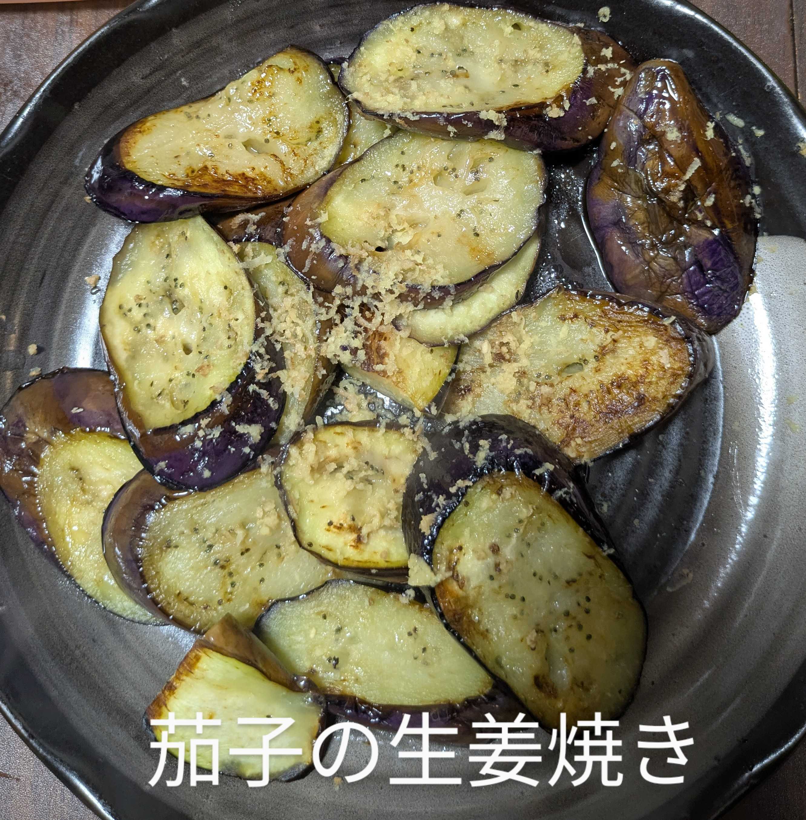 男料理(夕食)茄子の生姜焼き 焼き茄子に生姜をふりかけました