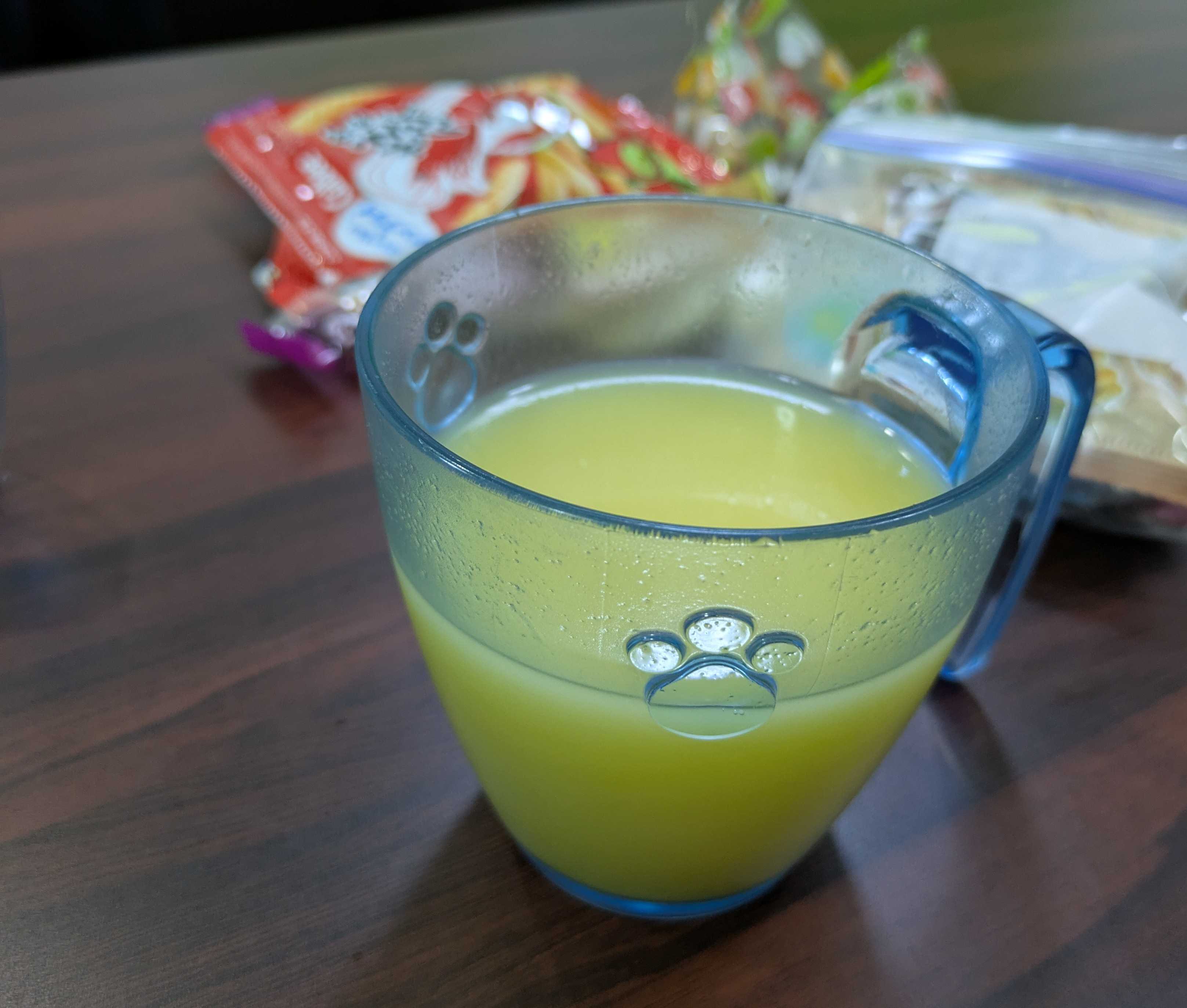 ホットコーンスープ カップのネコの足跡がかわいい💞 他にソフトクリーム コーラ ウーロン茶を飲みました お菓子は持ち込みしました