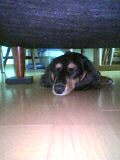 最近ロトは眠る時、暗い方がいいみたい。でもって暑いから冷たいフローリングがお気に入り。・・・・で、ソファーの下の暗くて冷たいところを見つけてお昼寝。いや、確かに顔隠してたら暗いとは思うんだけど・・・・ちょっとはみ出し過ぎじゃない???踏んづけちゃうよ。(^_^;)前から見るとこんな感じ。ロ~ちゃん、夏バテ?