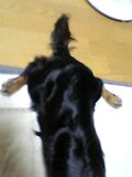 最近は家に帰るとロトと遊びながら一息つき、その後、軽くロトとお散歩という毎日。お散歩から帰るとハァハァ言ってるロトに牛乳やお水をあげて一休み。私がお茶を飲みながらテレビを見る頃、ロトも遊びつかれて私の手の下に鼻をつっこみなでろと催促。少しなでて手を置くとまたその下に鼻をつっこむ。これをやっぱりなんどか繰り返していた。ふと長いロトの胴の先を見るとなんかヘン。女の子がよくやるぺちゃんこ座りみたいになってる。ろ~ちゃん、いくらなんでもダラケすぎじゃない。